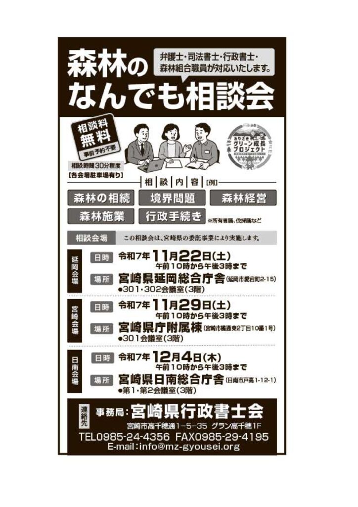 森林のなんでも相談会が開催されます。相談会では、森林のさまざまな相談に弁護士、司法書士、行政書士、森林組合職員が無料で相談に応じます。ご希望の会場まで直接お越しください。当日受付のため、事前予約は不要です。